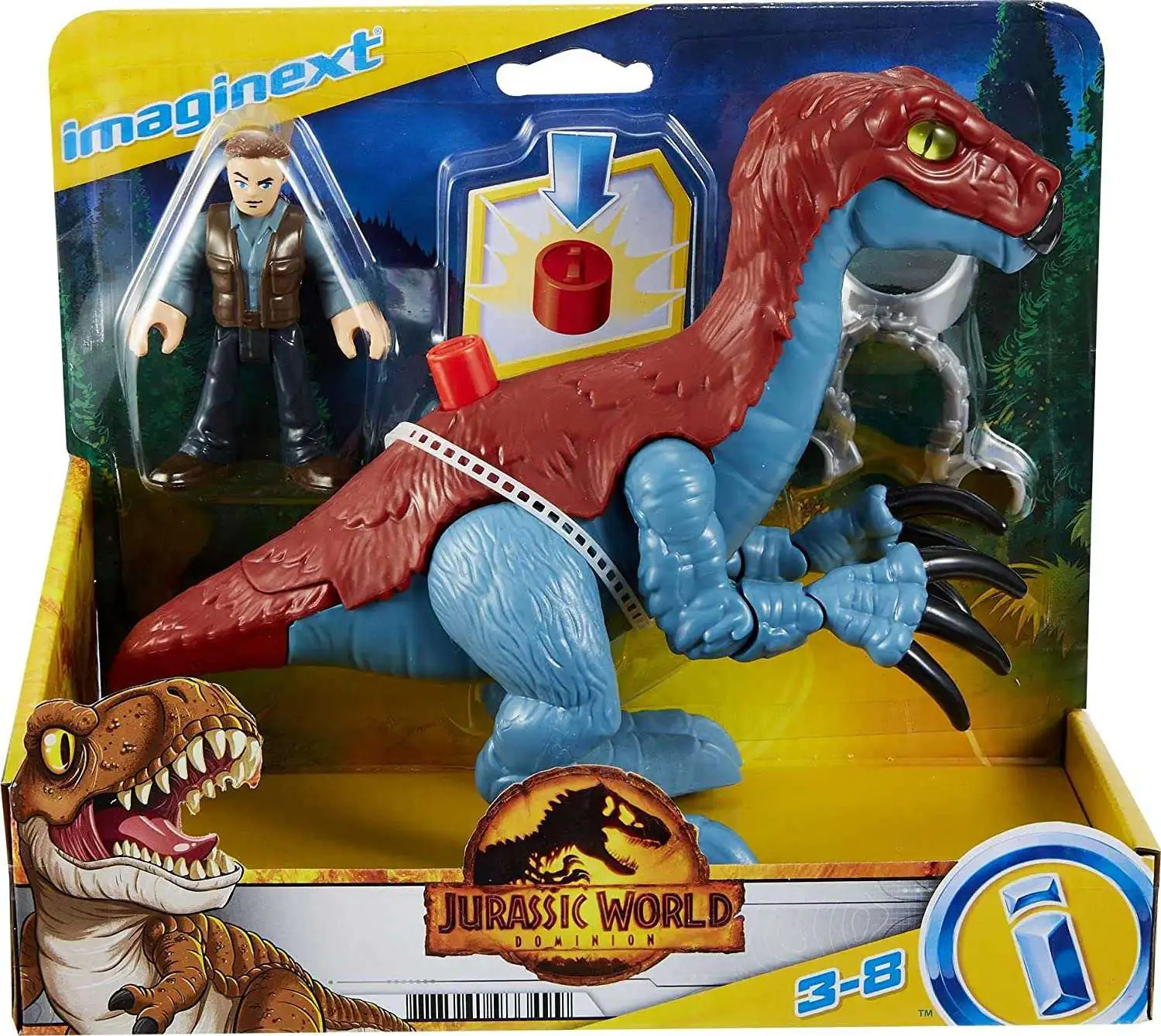 This is a new Jurassic World item for Imaginext. This is a new item with all new sculpt for the Dino and the figure. The Dino will have an Imaginext button on it that will activate the arms of the dino to lunge forward and alternate. When the arms are activated the dino will break the chains from his chest as well. The legs will be articulated, and the head and lower jaw will be articulated. The eyes will be clear parts with deco on the back. The Imaginext figure will have our standard articulation.