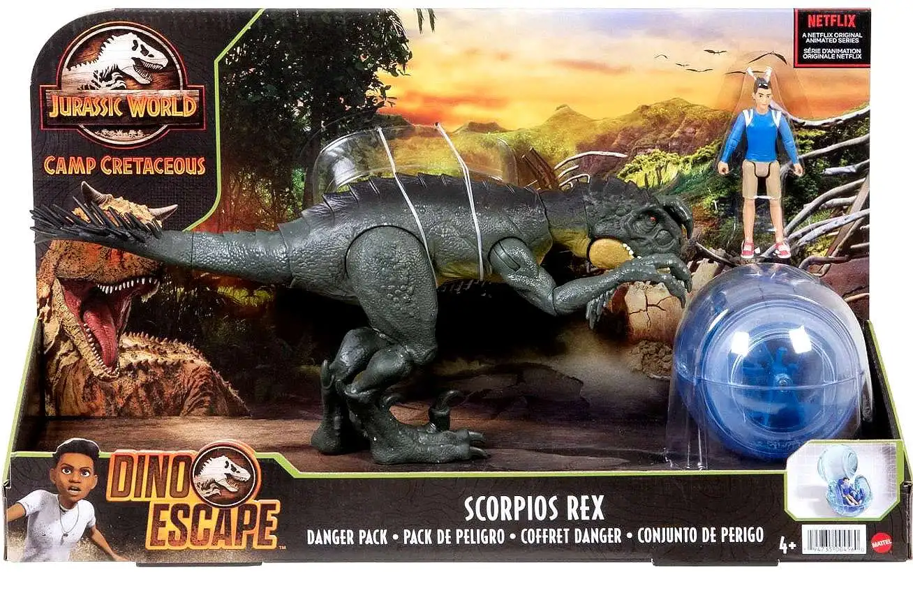 Get ready for more thrills and adventure with Jurassic World Dino Escape! Inspired by the animated series, Jurassic World: Camp Cretaceous, this Dino Danger Pack includes a Kenji figure, a Scorpios Rex Dinosaur and a Gyrosphere accessory! Recreate the perilous chase and attack scene from the series and play out more action-packed storylines! Both the Kenji and the Scorpios Rex Dinosaur figures have movable joints, authentic sculpting and realistic colors and textures for fun action play and dynamic posing. For ages 4 years old and up.
