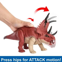 Get ready for thrills and adventure with figures inspired by Jurassic World Dominion. This Wild Roar assortment of medium sized dinosaurs not only have sound to bring roaring play to life, but also a species-specific attack action, from chomping to surprise tail attacks, activated by pressing down on the hip area. All figures feature movable joints, authentic sculpting and realistic colors and textures for fun action play and dynamic posing. Extended digital play is available by scanning their DNA tag in the improved Jurassic World Facts app. For ages 4 years old and up.