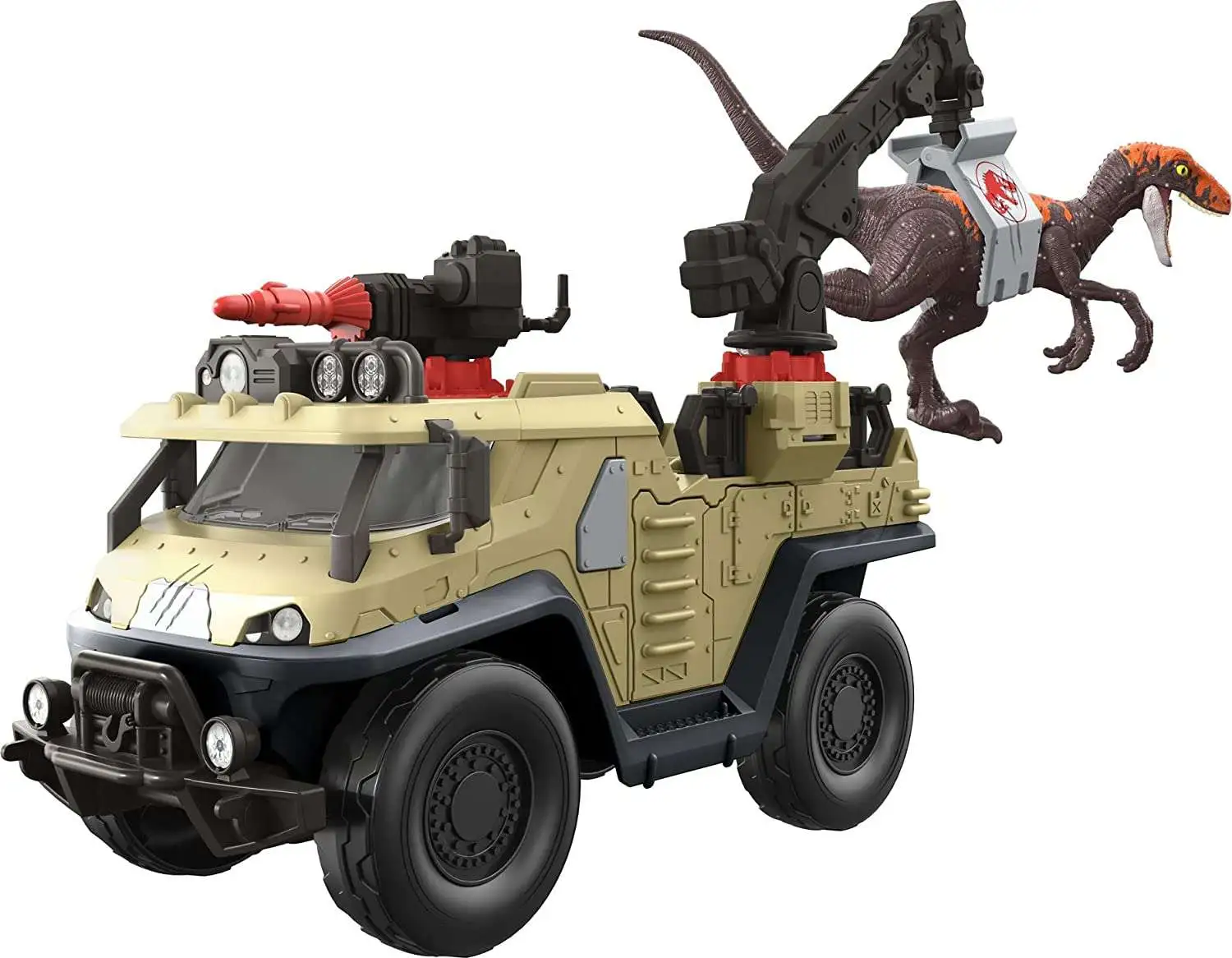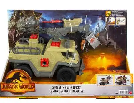 Get ready for thrilling action and adventure with Jurassic World! Inspired by the films, this larger-scale vehicle is geared to go and out to capture dinosaurs on the loose! Vehicle features rolling wheels for push-along play, a blaster to shoot dinos with a tranquilizer dart, an overhead crane with capture claw to lift the dinosaur figures, and a large bed for dino transport. Breakaway parts allow crushing action when the dino figures fight back! Vehicle comes with stretchy chains for locking down captured dinosaurs. Pack iincludes 1dinosaur figure for play right out of the box. Also Includes smart device mount for app-enhanced game play. (Smart device and dinosaur not included.)