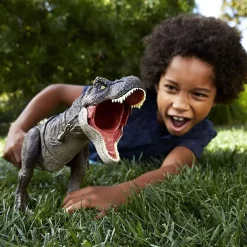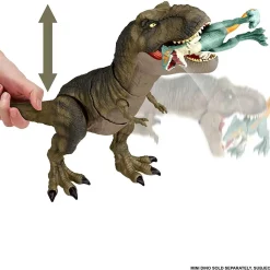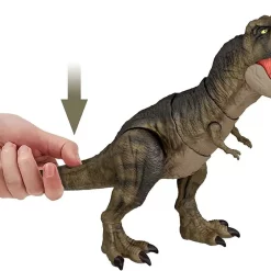 Get ready for thrilling action and adventure with Jurassic World Dominion! This Thrash ‘n Devour Tyrannosaurus Rex dinosaur figure is 21 inches long and has enhanced chomp and thrashing actions, roaring and thrashing sounds and comes with a cool marbleized look! Press the button on the tail for a mighty ROAR! Lift the tail up and the T. rex bends down to pick 3.75 inch human or dinosaur action figures. Move the tail down and it swallows the human figures whole! Then manipulate the tail to create dramatic thrashing action and sounds. Other figures sold separately It’s a must-have addition to any dinosaur toy collection and lets kids re-enact key scenes from the movie or use moveable joints to pose in a ferocious display. Bring the T. rex TO LIFE with extended digital play using Augmented Reality! Dare to see how REAL dinosaur play can get! Just scan the hidden DNA code with any smart device to unlock the AR experiences in the free Jurassic World Facts app. Smart device not included. Makes a great gift for lovers of dinosaur action play aged 4 years and up. Colors, dimensions and decorations may vary.