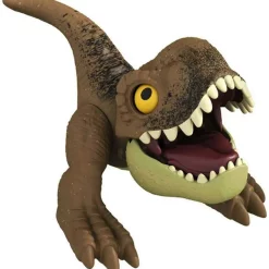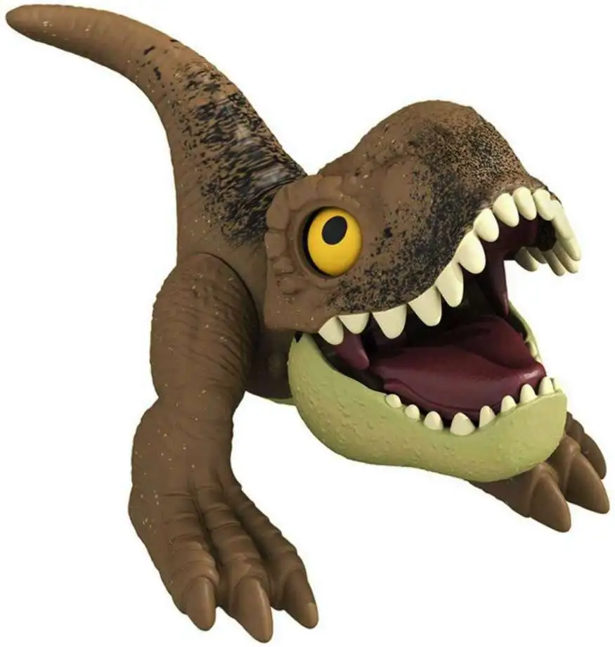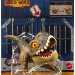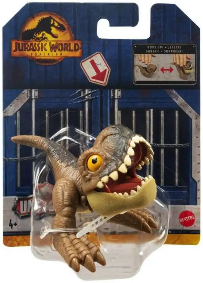These creatures feature stylized designs of dinosaurs from throughout the Jurassic World franchise. They have multiple poses, starting with a sleepy look. One press on the head, and the dino springs into action, ready to attack with mouth open. Another tap on the head and the dinosaur figure goes back to it back to its tame, sleepy look. Press again for the upright position, balanced on the back tail, like a baby bird ready for feeding. These pet-like toys make great gifts for ages 4 and up.