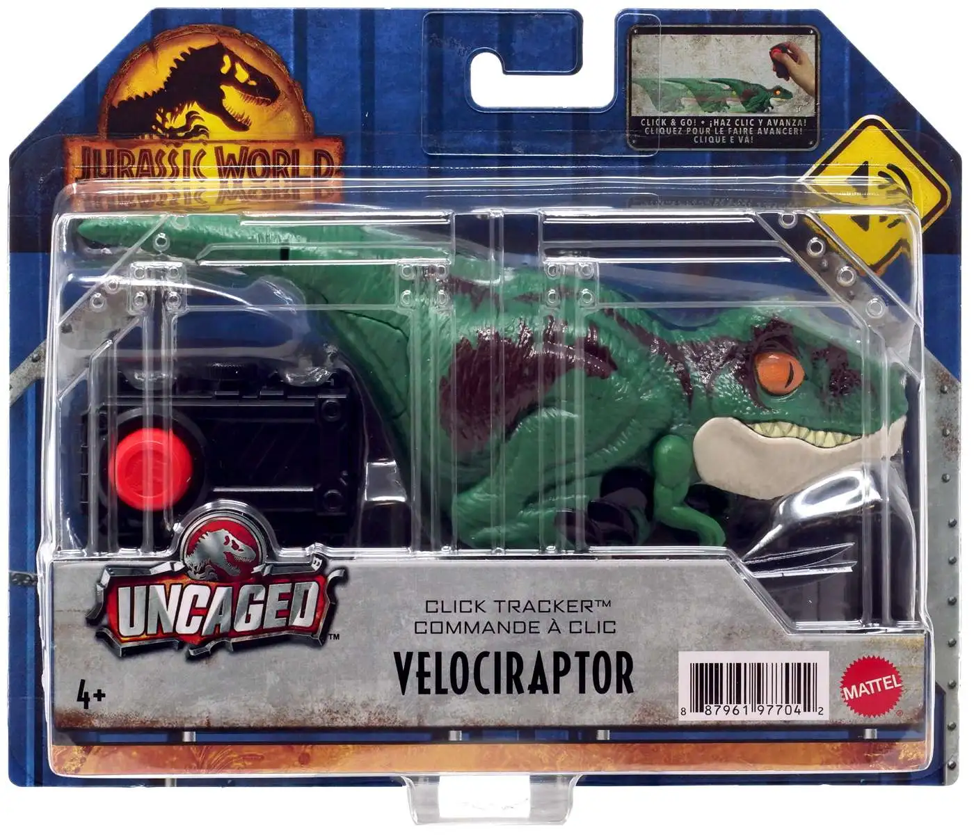 This special interactive Uncaged Click Tracker Velociraptor figure inspired by the thrills and adventure of Jurassic World: Dominion can really bring a dinosaur to life for kids ages 6 to 8 years old, with both movement and sounds that THEY CONTROL! Embracing the excitement of humans interacting with dinosaurs, this approximately 6 in long green dinosaur toy has been uncaged to give kids a unique play option — becoming a DINOSAUR TRAINER, just like Owen in Jurassic World! Using the provided handheld clicker, kids make the Velociraptor move forward, spin and issue cool sounds, but watch out, this dinosaur is still wild and a little unpredictable! The clicker can control more than one dinosaur, so kids can collect them all to become the alpha of their own pack! Each sold separately, subject to availability. Makes a great gift for dinosaur fans ages 4 years old and up.
