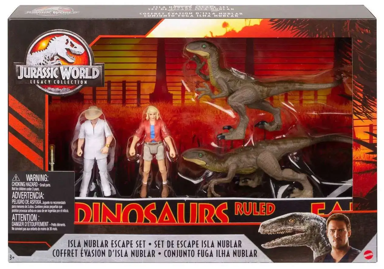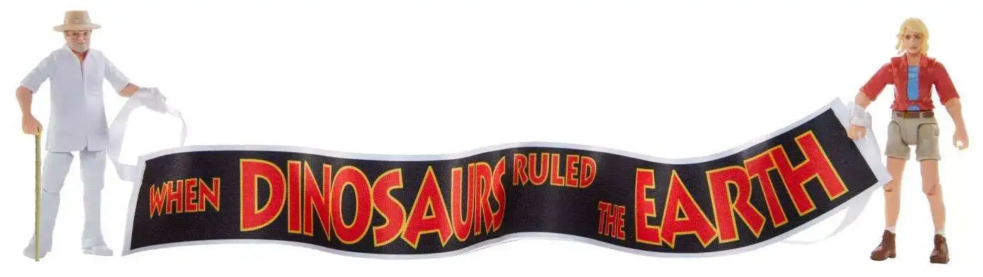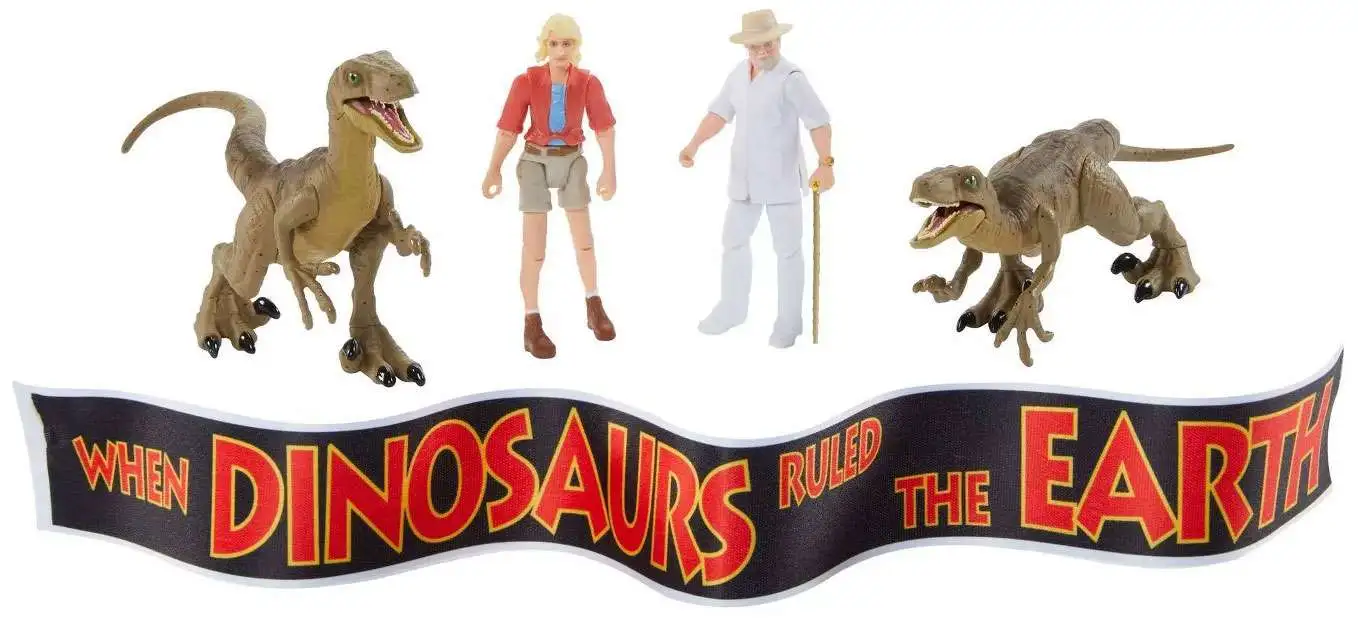 Relive nostalgic, iconic film moments with the Jurassic World Isla Nublar Escape Set that captures the spirit of the franchise legacy with movie-authentic decoration and deluxe detail! Inspired by the original Jurassic Park film, the set includes action figures of pioneering scientist and the father of Jurassic World, John Hammond and everyone’s favorite paleobotanist, Dr. Ellie Sattler (both figures are 6-in/15.24-cm tall). The set also includes two iconic Velociraptors (one in a crouching pose and one is standing) plus a film-inspired banner imprinted with “When Dinosaurs Ruled the Earth.” Take home the excitement of Jurassic Park with this collectible Isla Nublar Escape set! Makes a great collectible gift for ages 4 and up especially fans of the Jurassic World franchise, dinosaurs and action play! Colors and decorations may vary.