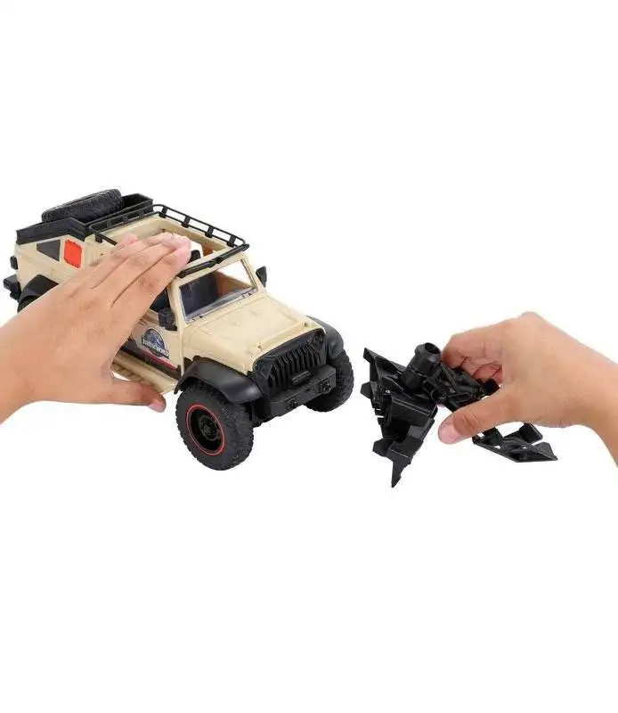 Recreate the thrills and excitement from Jurassic World Dominion with this movie-inspired R/C vehicle! The stylized Jeep Gladiator features true-to-movie details and comes with a remote control, removable auto-capture claw and 6-inch Dracorex Dino figure that encourages kids to recreate their favorite scenes from the film or invent new ones. When the dino touches the spring-triggered bumper, the claw immediately launches and grabs the figure. The 1:18 scale R/C vehicle has full functionality -kids can use the remote control to move backward, forward, left and right as they play out dino chases and captures! The realistic interior has space for kids to put their own action figures to help drive exploration and adventure (action figures sold separately, subject to availability). Colors and decorations may vary.